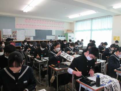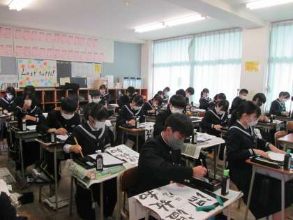 3年生は「温故知新」という言葉を書初で書きました。みんな真剣に臨んでいました。