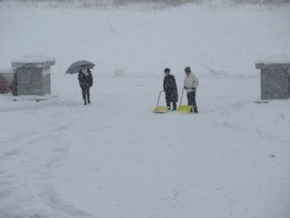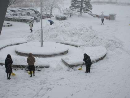 生徒たちと“共に”学年スタッフも除雪を行いました。