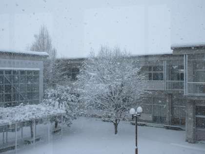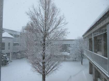 今日は大変冷え込み、昨日から降った雪が樹木の枝にくっつき雪の花となっています。