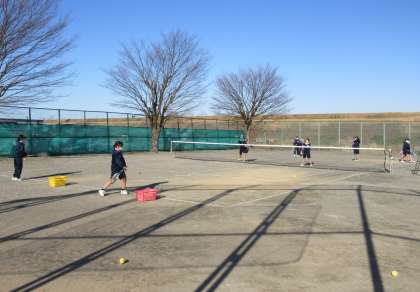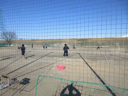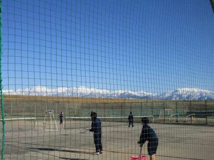 ソフトテニス部は、雄大な立山連峰をバックに練習に励んでいました。