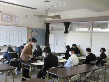 3年4組の国語の少人数授業の様子です。 写真上段 教室グループ 写真下段 視聴覚室グループ