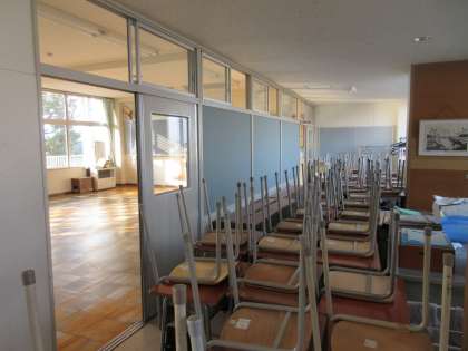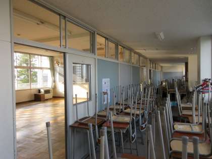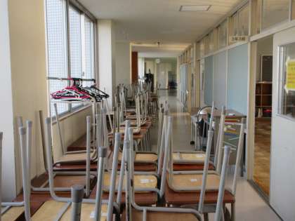 教室のワックスがけのため、教室前廊下は机であふれかえっています。