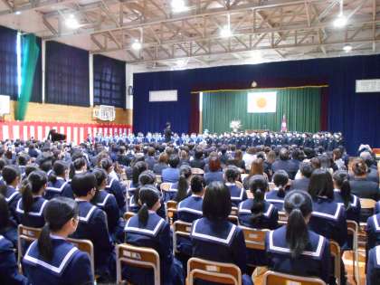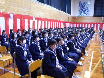 3月15日(水) 第35回卒業式 在校生 公開日 2023/03/16 更新日 2023/03/16 news 本日の卒業式は、2年生が体育館の中で参列しました。 昨年まで在校生は自宅での家庭学習でしたが、今年度は、2年間お世話になった2年生が体育館で、1年生は柔剣道場でリモートにより参加しました。 2年生は、お世話になった卒業生の姿をしっかり目に焼き付け、来年は自分たちの番だという意識で参加していました。