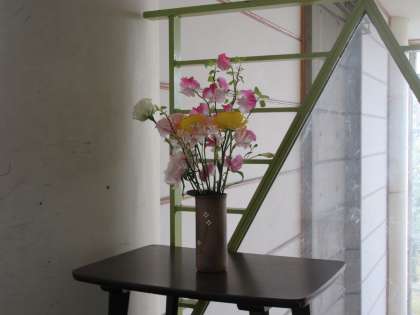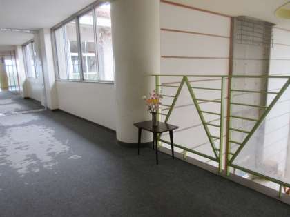 校長室前廊下には花瓶に花が飾られています。