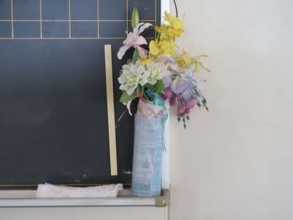 職員室前の日課黒板の一角にもひっそりと花が飾られています。