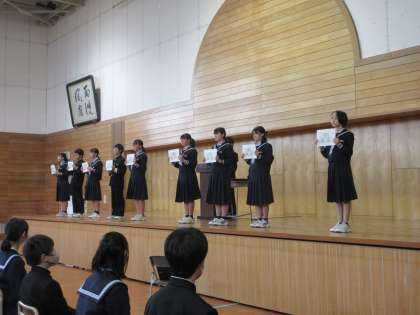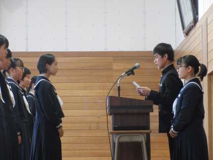 新しい生徒会長より、生徒会執行委員・専門委員会委員長に任命書が授与されました。最後に、校長より後期の活動に対するねぎらいと「来年度は、新しい学年で新しい風を吹かせてほしい」という激励の言葉が贈られました。