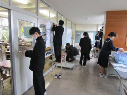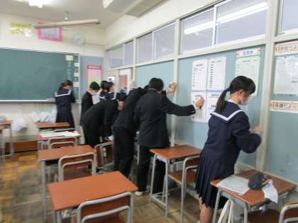 教室に掲示してあったあらゆる掲示物を外したり、黒板上部や棚などのホコリを拭き取ったり、窓を磨いたりしました。