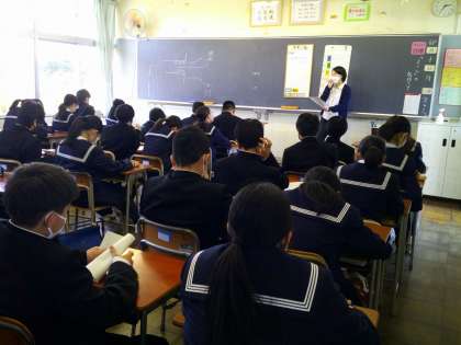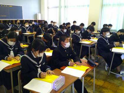 6限の学活では、「入学のしおり」を元に、清掃、給食、学習、テストの受け方、生徒会について等中学校生活について理解できるよう、メモをしながら担任の先生の話を一生懸命聞いています。