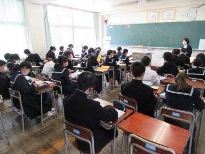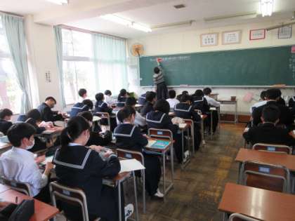写真上段 1−1 国語 漢字の勉強についての話を聞いていました。