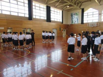 写真下段 1−2 保健体育 集団行動について学習しました。