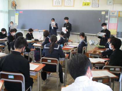昨日の代議員会・専門委員会を受けて、各クラスの代表生徒が活動内容等を報告しました。