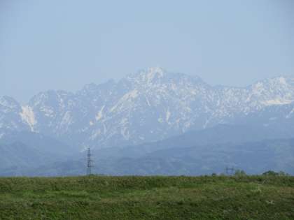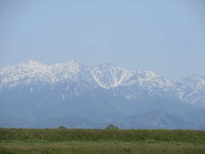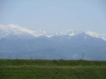 かなり雪が解けて、手前の方の山々は白から緑に変わりつつあります。