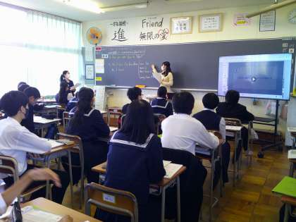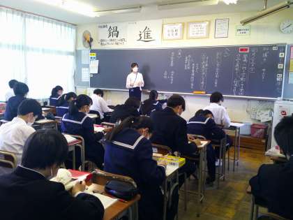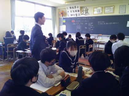 3年生も、担任の先生方による教科の授業をしています。先生の質問に頷きながら話を聞いている生徒もいます。