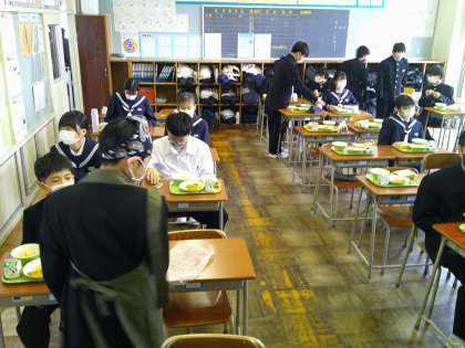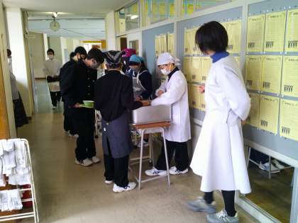 1年生の給食準備は、4限終了後15分後に「いただきます」を目指しています。中学校の給食システムにも徐々に慣れてきました。