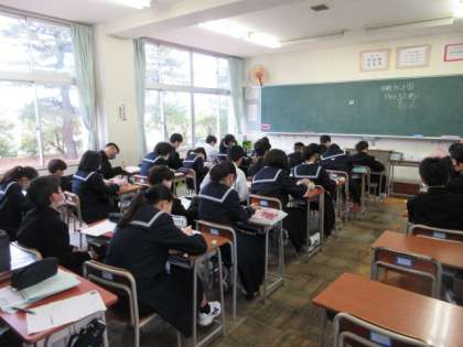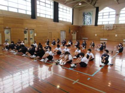 写真上段 1−1 保健体育 体力テストの説明を聞いていました。