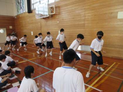 写真上段 1−3 保健体育 スポーツテストで反復横跳びの記録を測定していました。