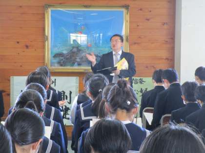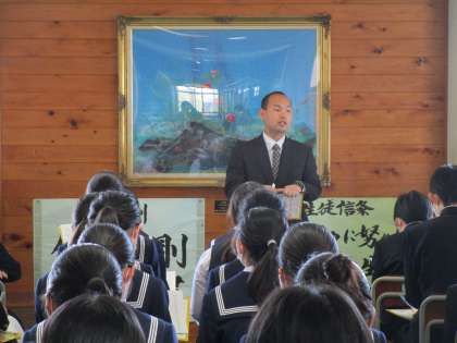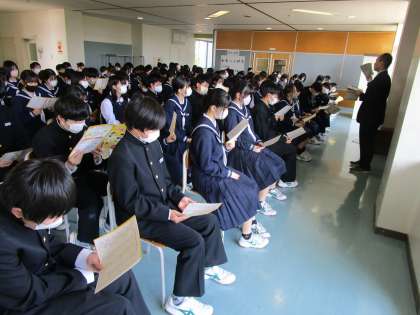 4月27日(木) 2年「総合的な学習の時間」 「社会に学ぶ『14歳の挑戦』」 公開日 2023/04/27 更新日 2023/04/27 2学年 本日5限「総合的な学習の時間」では、「社会に学ぶ『14歳の挑戦』」についての学年集会を行いました。 学年主任から全体的な概要について、柳先生から詳細についての話がありました。 生徒は非常に楽しみにしている様子で、真剣に話を聞いたり、配布された事業所一覧を見たりしていました。