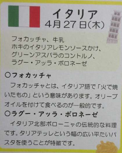今日の給食は、サミット給食第4弾イタリアの料理を取り入れたメニューでした。