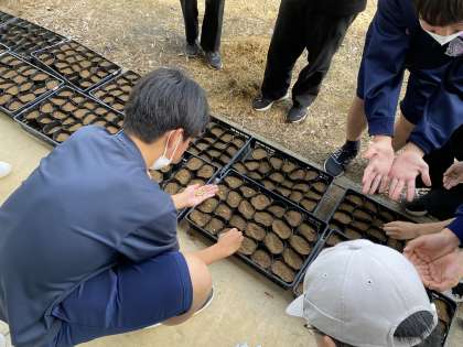 技術の授業でえだまめ栽培をするため、3年生有志で放課後に準備を行いました。