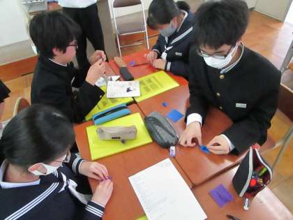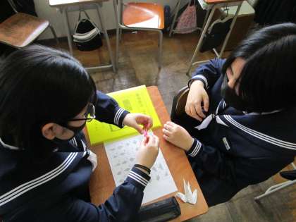5月1日(月) 3年 「総合的な学習の時間」 公開日 2023/05/01 更新日 2023/05/01 3学年 5月31日に広島平和記念公園で献納する千羽鶴作りが始まりました。 平和への祈りを込めて一羽一羽丁寧に折ります。