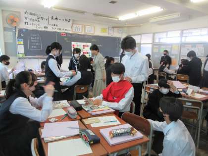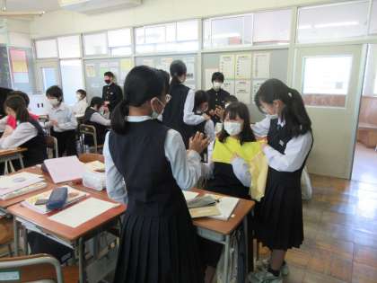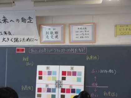 5月11日(木) 2年 授業風景 公開日 2023/05/11 更新日 2023/05/11 2学年 2年生の今日の授業の様子です。 2年1組の家庭科の授業の様子です。 「私に似合うパーソナルカラーは何だろう?」という学習課題でした。 グループごとに布をあてて、似合う色を見付けていました。 とても楽しそうな活動でした。