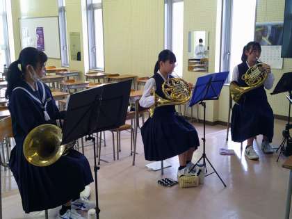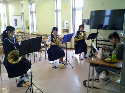 今日はホルンパートの練習で、外部講師の先生に来ていただいています。講師の先生からのアドバイスを真剣に聞き、すぐに実践しています。
