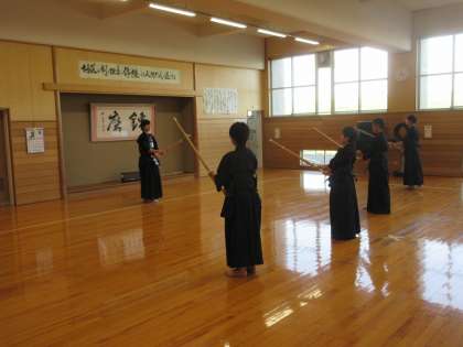 剣道部は、3年生が1年生の前に立ち、手本を示しながら指導をしていました。