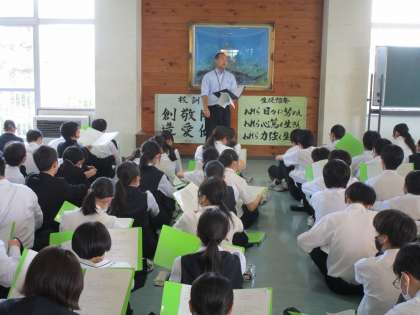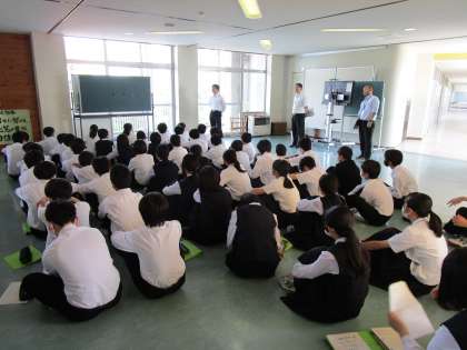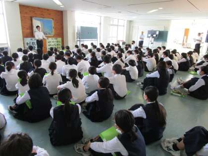本日6限、総合的な学習の時間に「14歳の挑戦」についての学年集会を行いました。
