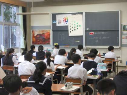 1年生の今日の授業の様子です。 写真上段 1−3 英語 写真下段 1−4 美術