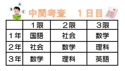 明日はいよいよ中間テスト1日目です。実施教科は次のとおりです。