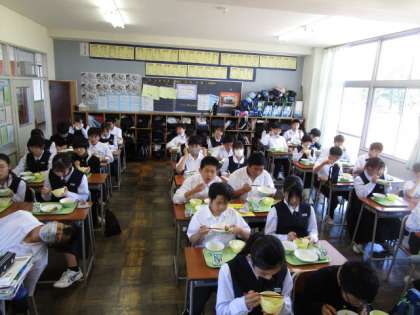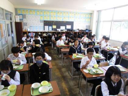 1年生はおかわりもしながら、もりもり食べています。 写真上段 1年3組 写真下段 1年4組