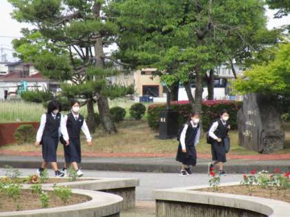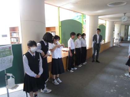 今朝も元気に1、2年生が登校してきました。今日の挨拶当番は1年生です。さわやかな挨拶を交わしています。