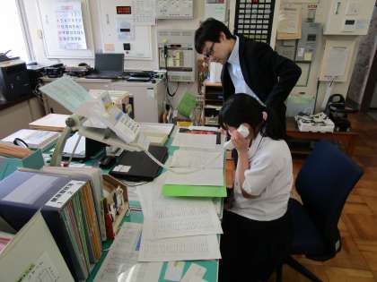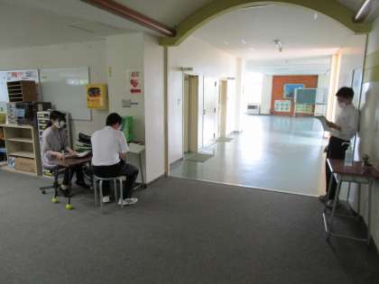 各事業所の班長が、職員室の電話と職員室前にある公衆電話を使って電話をしました。