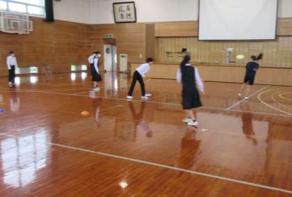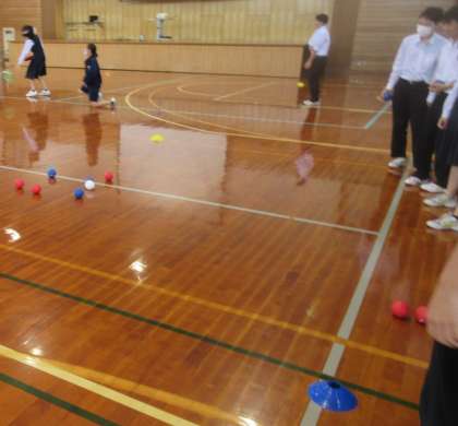 スポーツテストのまとめをした後、ニュースポーツ体験を行いました。