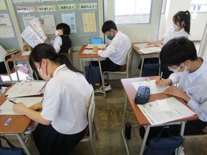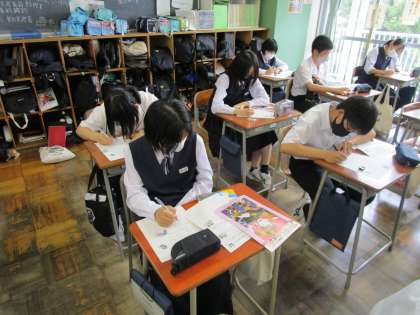 講演会が終わった後は、各クラスで感想を書きました。 1・2組の様子です。