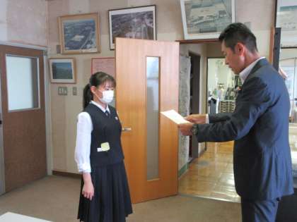 昨日昼休み、本校から「TOYAMAアスリートマルチサポート事業」の水泳/アーティスティックスイミング部門の選手として選ばれた生徒の指定選手証授与式を校長室で行いました。