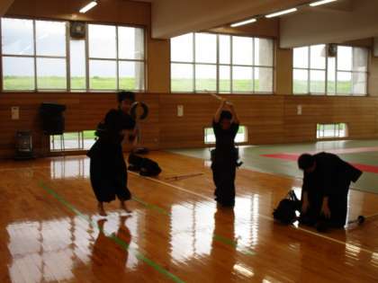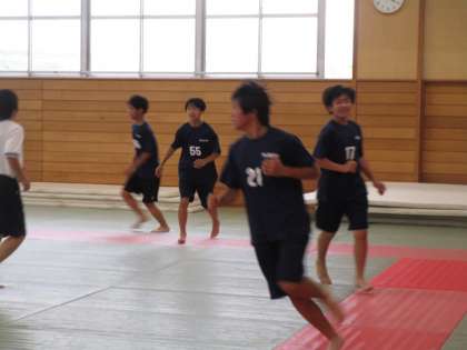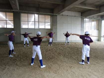 武道場では、剣道部とサッカー部が、ピロティでは野球部が活動しています。