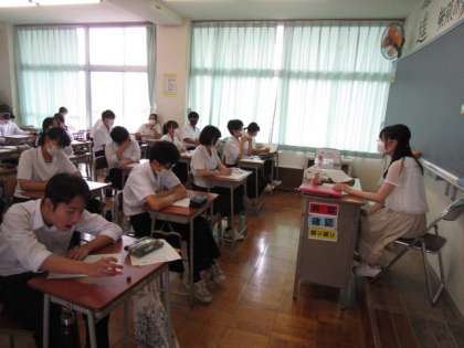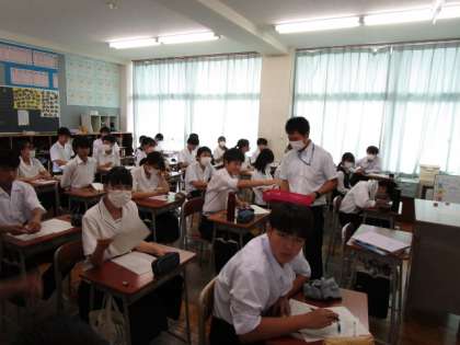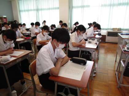 3年生は、学活で合唱コンクールの選曲をしています。それぞれの曲の感想やイメージをメモしながら、自分たちの学級にふさわしい曲を考えています。