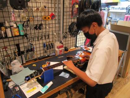 開進堂楽器 楽器センター富山:商品のギターの手入れを行っていました。生徒は普段から家でギターに触っているとのことでしたが、メンテナンスは初めての様子。よりギターについて理解が深まったようです。