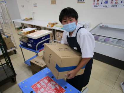 お中元の季節ということで、裏方で荷物運びやのしの貼り付けを行っていました。