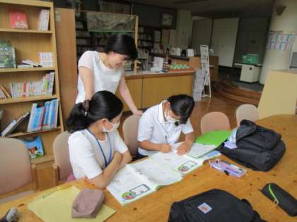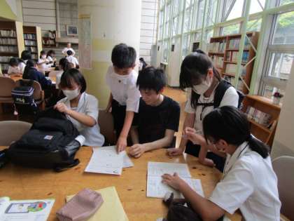 生徒が分からないことを教員に質問して教えてもらっています。一人の生徒の質問の回りに仲間が集まって、互いに教え合う場面もあります。