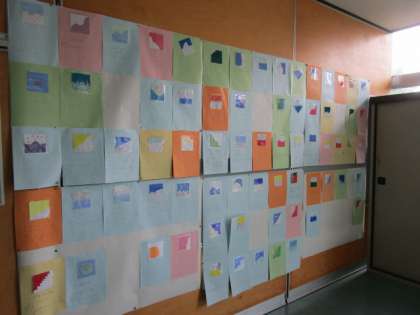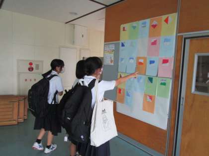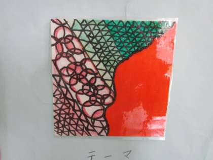 7月15日(土) 美術作品コーナー 公開日 2023/07/15 更新日 2023/07/15 1学年 1年生のコモンスペースには、美術作品が掲示されています。各自がテーマに合ったデザインを考え、コースターを作成しました。来週から始まる保護者懇談会の際に、ぜひご覧ください。