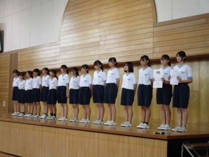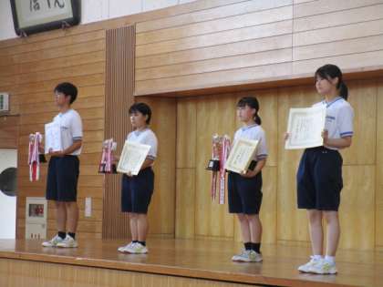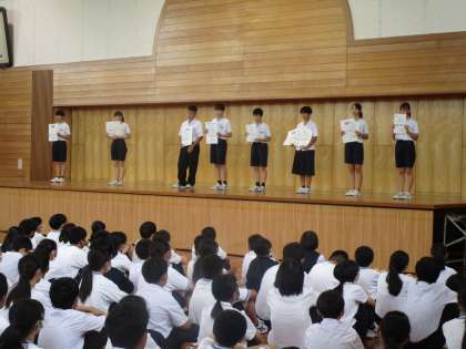 1学期に受賞した生徒達の受賞報告を行いました。芸術、文化、スポーツ等で数多くの受賞者が壇上に並びました。