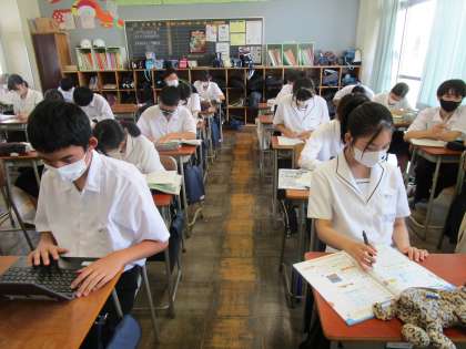 7月21日(金) 2年 1学期最後の授業 公開日 2023/07/21 更新日 2023/07/21 2学年 2年2組の理科の授業の様子です。 理科の授業内容が終わっており、自習をしていました。 お礼状を作成している生徒もいました。