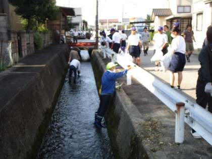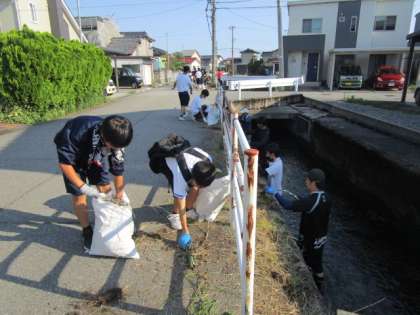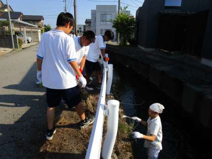 7月23日(日) 島用水路・半俵川排水路一斉清掃 公開日 2023/07/23 更新日 2023/07/23 news 用水には、意外なことに不燃物や大型のゴミまでたくさんありました。地域の大人の方がそれらを拾い上げ、生徒が袋にいれます。