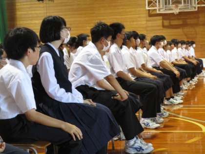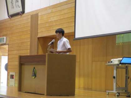 終業式では、まず始めに3年生による意見発表がありました。1学期を通しての課題と、成長点を述べ、2学期に向けて頑張りたいことを発表しました。