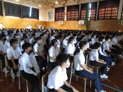 鍋田校長からは、式辞の中で「自分を成長させる夏休み」についてお話がありました。式辞の中にもあったように、1年生は、小学校の頃の自分より成長した「中学生として」の夏休みに、2年生は「藤ノ木中学校」という名を背負って活動していく2年生に、3年生は自分の将来のことについて考える夏休みにしていきましょう。