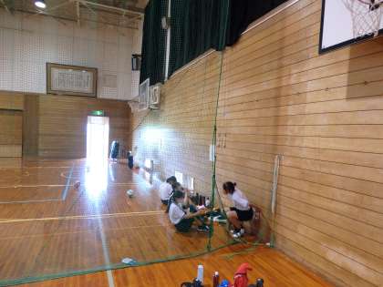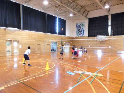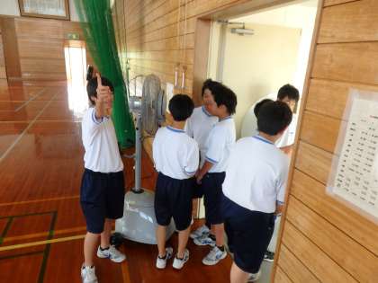 男女バレーボール部、男子バドミントン部の様子です。 扇風機前は人気の休憩スポットです。