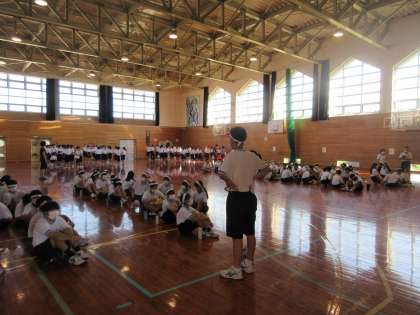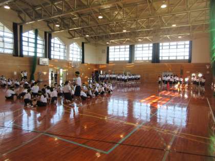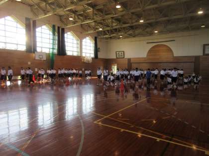 1年生は、1限体育館で、体育大会の学年種目の練習を行いました。