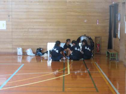 熱中症対策もしっかりと取って、大型扇風機の前で水分補給をしています。